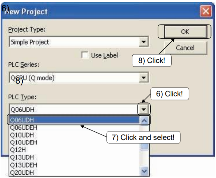 Click vào nút “PLC Type”-> Danh sách “PLC Type” hiện ra. Chọn “Q06UDH”..-> click OK