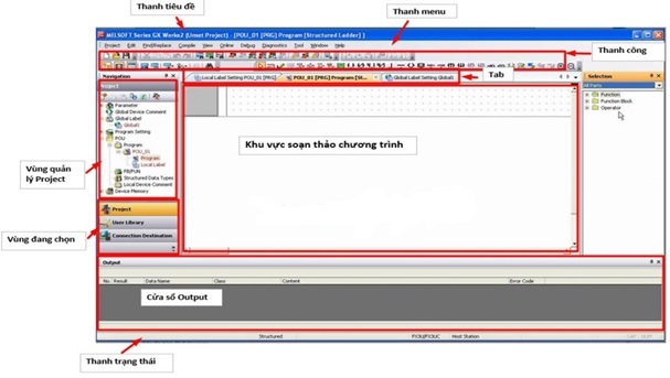 Thanh trạng thái thể hiện thông tin trạng thái của GX Works2.