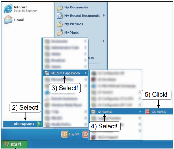 Bạn Click biểu tượng Start ->Chọn [All Programs].-> [MELSOFT Application].-> [GX Works2].-> Click [GX Works2].
