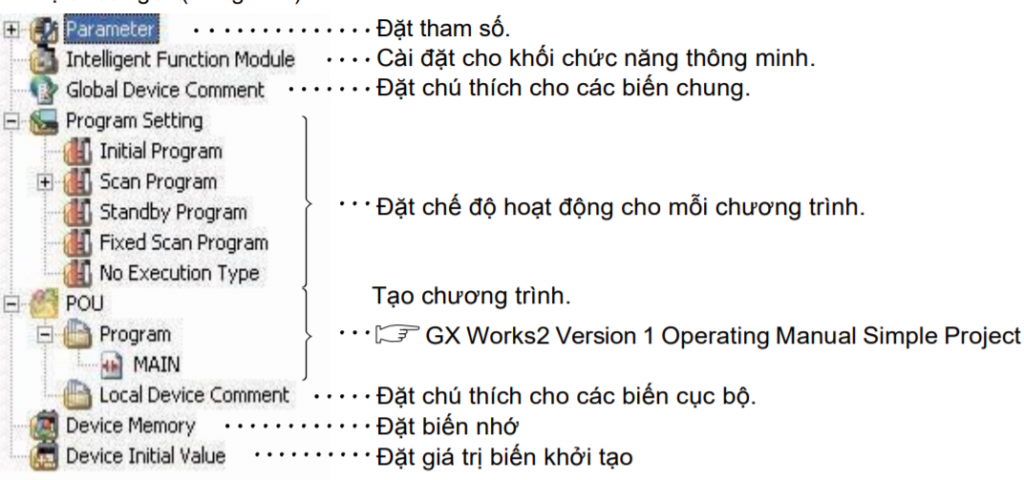 Cấu hình của một dự án được hiển thị theo dạng cây. Nội dung hiển thị khác nhau theo loại bộ điều khiển khả trình.