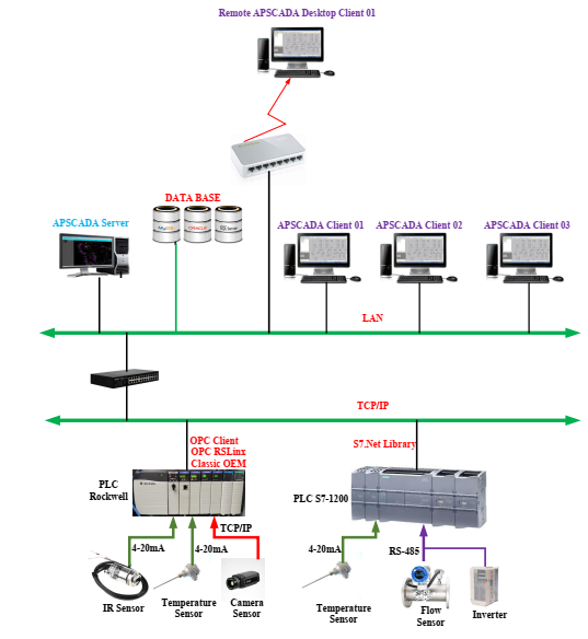Các kỹ sư An Phát đã sử dụng phần mềm OPC RSLinx Classic OEM để kết nối máy tính chủ với nhiều PLC của Rockwell, dữ liệu được đưa về máy chủ (APSCADA Server), sử dụng OPC Client đưa dữ liệu về xử lý trên phần mềm giám sát được An Phát thiết kế dựa trên nền tảng C#(WPF). Đối với các thông số mới được bổ sung, các kỹ sư An Phát đã lắp đặt thêm cảm biến mới, các tín hiệu từ cảm biến được đưa về trạm PLC S7-1200 của Siemens, thông qua thư viện S7.Net Library kết nối Kết nối C# với PLC S7-1200.