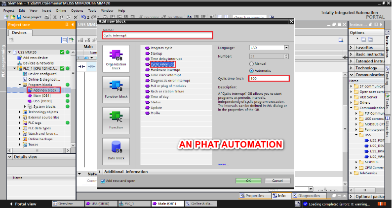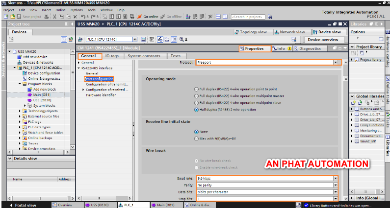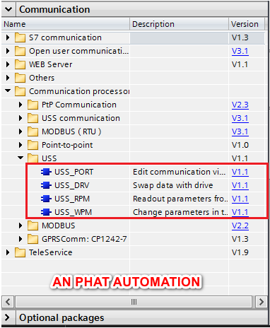 Trên TIA Portal, Siemens cung cấp thư viện kết nối với USS với 4 khối hàm chính.