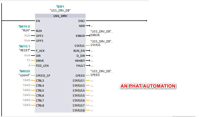 USS_DRV: Điều khiển một thiết bị trên mạng USS, ở đây US_DRV cung cấp khả năng tắt mở, điều khiển tần số cho biến tần Siemens.